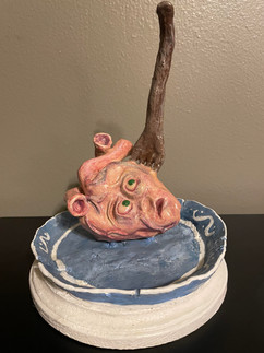 Movies have also inspired her artwork. In 2020, during the pandemic, she decided to try sculpting, which she’d been learning about through YouTube. Thinking of literature or film, she imagines a backstory, then sculpts air-dry, mineral-based clay to realize it. For her first piece, she imagined the heart’s perspective in Edgar Allan Poe’s short story “The Tell-Tale Heart.” The result is a heart with eyes and exaggerated facial expressions set on a plate and with a fork sticking through it. She describes her style as surrealistic, whimsical, and stylized. Other completed pieces featured a tree and a “Rock Star Frosty the Snowman” with a microphone and guitar attached. In progress are pieces featuring a Venus flytrap and a jack-in-the box.